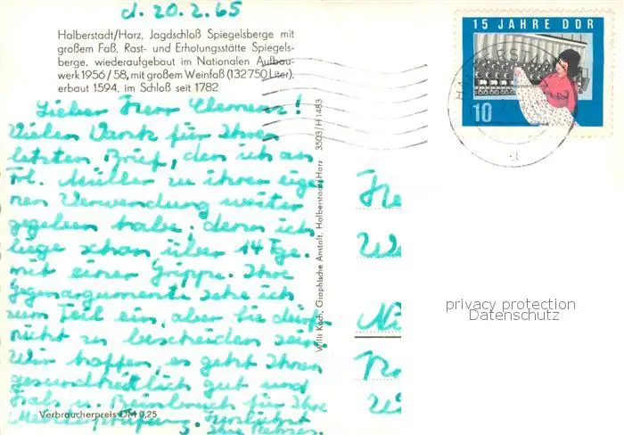 Halberstadt Jagdschloss Spiegelsberge mit grossem Fass Halberstadt postalisch gelaufen 1965 Erhaltung siehe scans [WerneD78] WernPID7