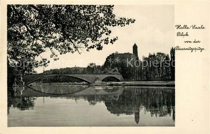 AK / Ansichtskarte Halle_Saale Blick von der Peissnitzspitze Bruecke Burg Giebichenstein Bromsilber Imitation Halle_Saale