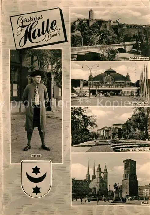 AK / Ansichtskarte Halle_Saale Hallore Giebichenstein Hauptbahnhof Theater des Friedens Markt Halle_Saale
