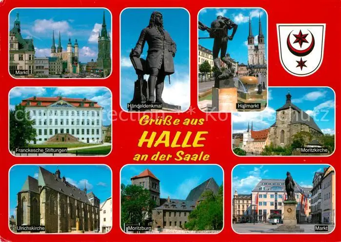 AK / Ansichtskarte Halle_Saale Markt Haendeldenkmal Hallmarkt Franckesche Stiftungen Moritzkirche Ulrichskirche Moritzburg Markt Halle_Saale