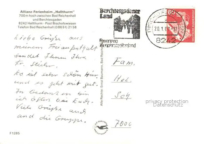 Hallthurm Allianz Ferienheim Hallthurm postalisch gelaufen 1987 Erhaltung siehe scans [WerneD78] WernPID7