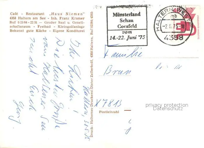 Haltern_See Café Restaurant Haus Niemen Steg Segeln Haltern See postalisch gelaufen 1975 Erhaltung siehe scans [FriedD77] Frierer