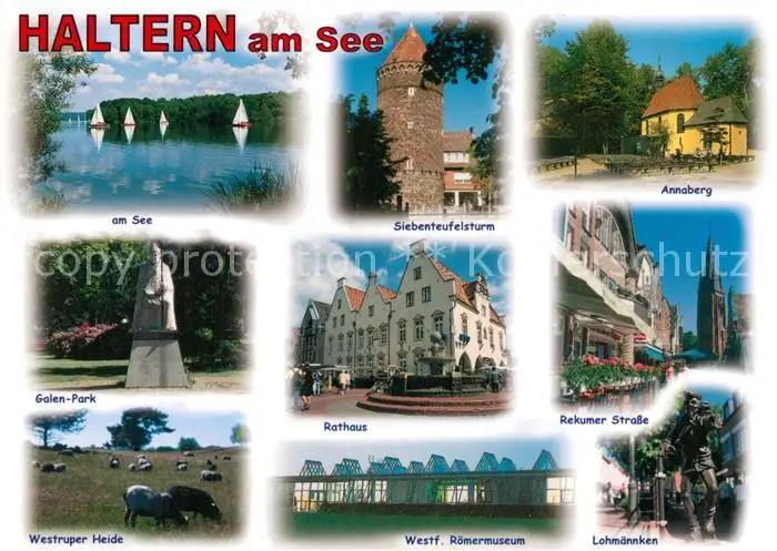AK / Ansichtskarte Haltern_See Siebenteufelsturm Annaberg Golenpark Denkmal Statue Rathaus Kirche Roemermuseum Lohmaennken Westruper Heide Haltern See