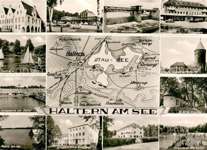 AK / Ansichtskarte Haltern_See Walzenwehr Seehof Stadtmuehle Jugendherberge St.Anna Kapelle Siebenteufelsturm Haltern See