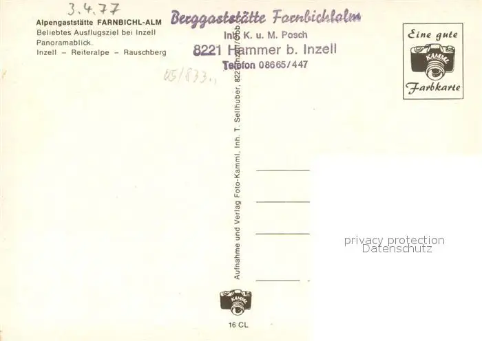 Hammer_Inzell Farnbichl Alm Gastraeume postalisch nicht gelaufen 1977 Erhaltung siehe scans [WerneD78] WernPID7