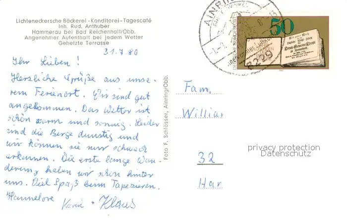 Hammerau Lichteneckersche Baeckerei Konditorei Tagescafé Ortsansicht mit Kirche Alpen Hammerau postalisch gelaufen 1980 Erhaltung siehe scans [FriedD77] Frierer