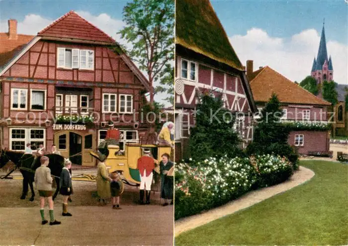 AK / Ansichtskarte Hanstedt_Nordheide Gaststaette zum Dorfkrug Postkutsche Blick zur Kirche Hanstedt_Nordheide