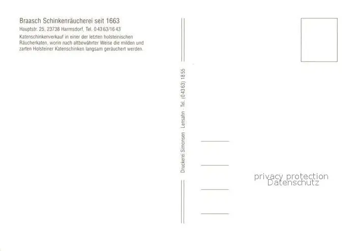 Harmsdorf_Holstein Braasch's Schinkenraeucherei Harmsdorf_Holstein postalisch nicht gelaufen nach 1965 Erhaltung siehe scans [FriedD77] Frierer