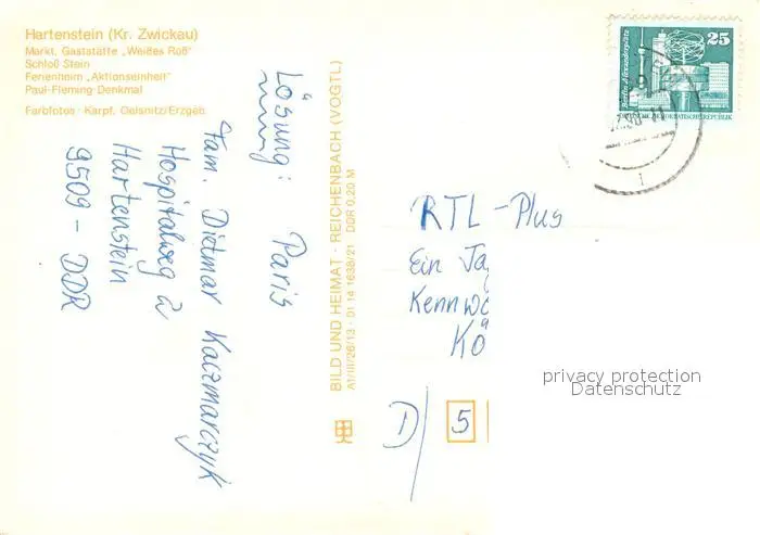 Hartenstein_Zwickau Markt Gaststaette Weisses Ross Schloss Stein Ferienheim Aktionseinheit Paul Fleming Denkmal Hartenstein_Zwickau postalisch gelaufen nach 1965 Erhaltung siehe scans [WerneD78] WernPID7