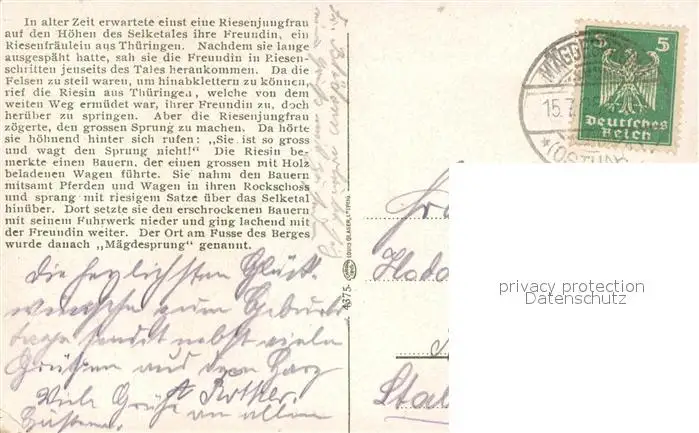 Harz_Region Die Sage vom Maegdesprung Harz Region postalisch gelaufen 1925 Erhaltung siehe scans [WerneD78] WernPID7