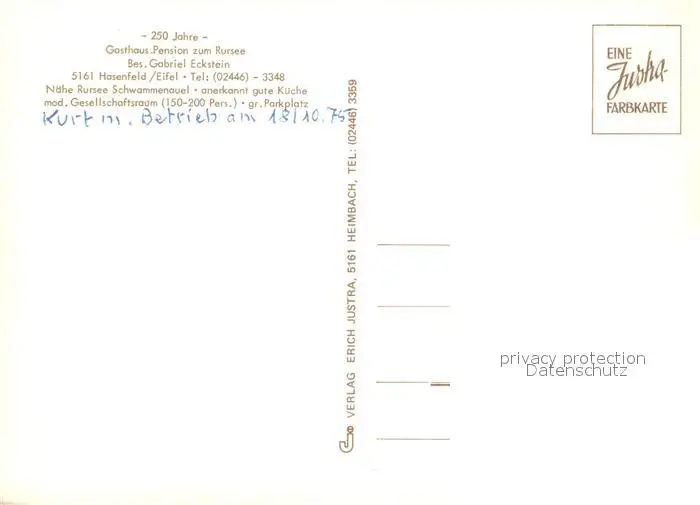 Hasenfeld 250 Jahre Jubilaeum Gasthaus Pension zum Rursee Hasenfeld postalisch nicht gelaufen 1975 Erhaltung siehe scans [FriedD77] Frierer