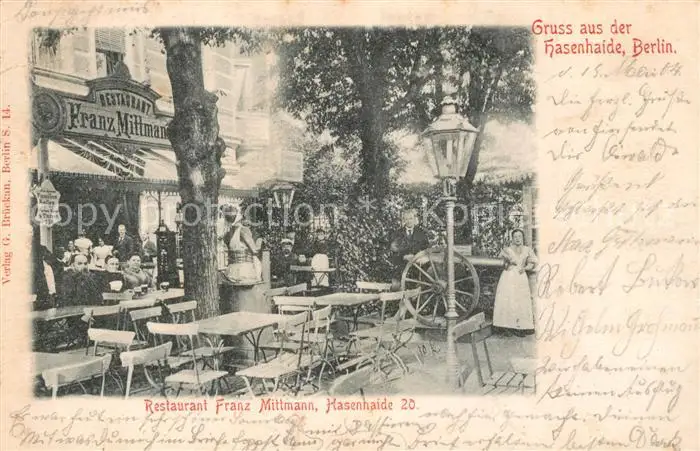 Hasenhaide Berlin Kategorie Alte Ansichtskarten Postkarten bx75722 Hasenhaide_Berlin Restaurant Franz Mittmann Hasenhaide 20. Hasenhaide Berlin postalisch gelaufen 1904 Erhaltung siehe scans [LiesaD40]