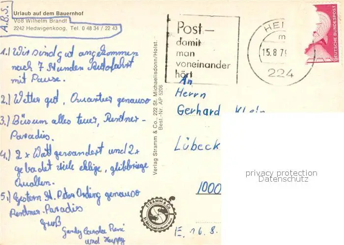Hedwigenkoog Urlaub auf dem Bauernhof Brandt Hedwigenkoog postalisch gelaufen 1979 Erhaltung siehe scans [FriedD77] Frierer