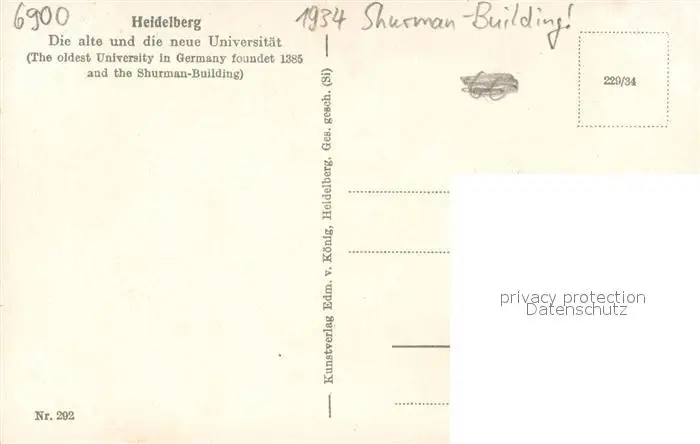 Heidelberg_Neckar Alte und neue Universitaet Shurman Building Heidelberg Neckar postalisch nicht gelaufen 1934 Erhaltung siehe scans [FriedD77] Frierer