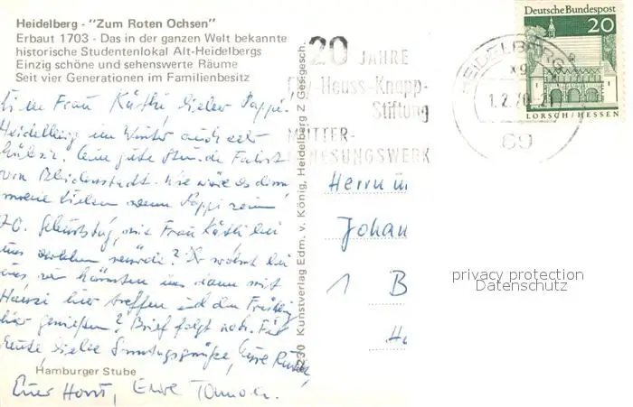 Heidelberg_Neckar Zum Roten Ochsen Studentenlokal Heidelberg Neckar postalisch gelaufen 1970 Erhaltung siehe scans [WerneD78] WernPID7