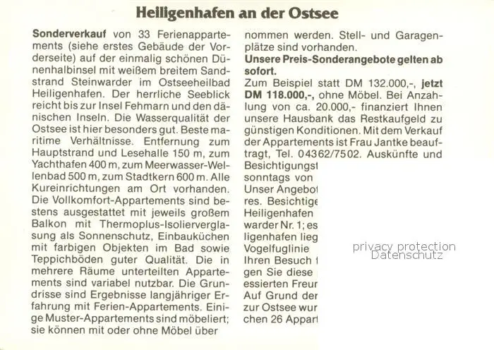 Heiligenhafen_Ostseebad Ferienappartements Verkaufsangebot Fliegeraufnahme Heiligenhafen_Ostseebad postalisch nicht gelaufen 1982 Werbekarte (keine Postkarte) Erhaltung siehe scans [FriedD77] Werbekarte (keine Postkarte) Frierer