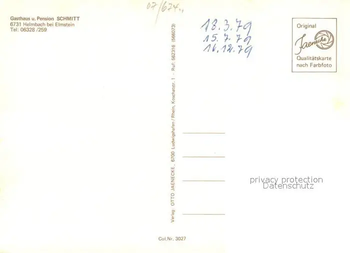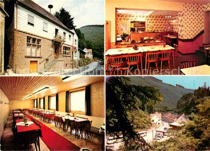 Helmbach_Elmstein Gasthaus Pension Schmitt Gastraum Ortsansicht Helmbach_Elmstein postalisch nicht gelaufen 1979 Erhaltung siehe scans [FriedD77] Frierer