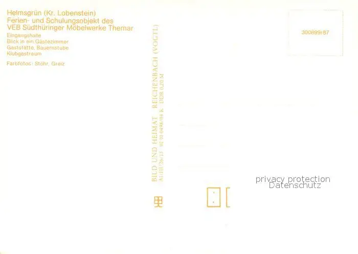 Helmsgruen Ferien und Schulungsobjekt des VEB Suedthueringer Moebelwerke Themar Eingangshalle Gaestezimmer Gaststaette Bauerntube Klubgastraum Helmsgruen postalisch nicht gelaufen nach 1965 Erhaltung siehe scans [WerneD78] WernPID7