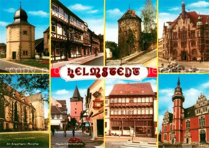 AK / Ansichtskarte Helmstedt Altes Taubenhaus Fachwerkhaeuser Alter Stadtturm Rathaus St Stephani Kirche Hausmannsturm Pressehaus Juleum Helmstedt
