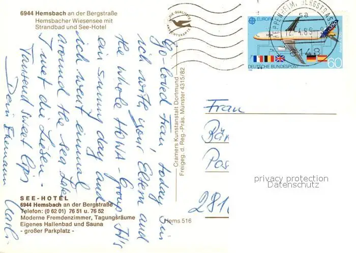 Hemsbach_Bergstrasse Hemsbacher Wiesensee mit Strandbad und Seehotel Fliegeraufnahme Hemsbach_Bergstrasse postalisch gelaufen 1989 Erhaltung siehe scans [FriedD77] Frierer