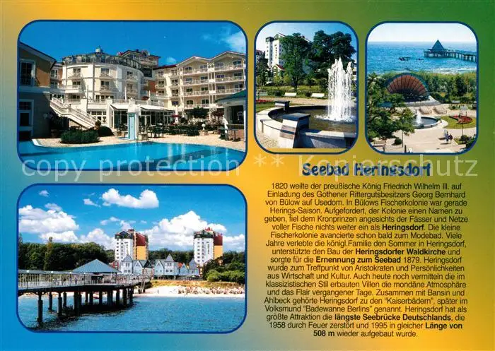 Heringsdorf_Ostseebad_Usedom Hotel Brunnen Konzertpavillon Seebruecke Strand Chronik Heringsdorf_Ostseebad postalisch nicht gelaufen nach 1965 Erhaltung siehe scans [FriedD77] Frierer