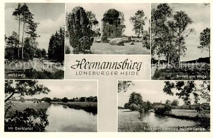 AK / Ansichtskarte Hermannsburg Waldweg Hermann Loens Denkmal Birken am Weg Im Oertzetal Oertzepartie Hermannsburg
