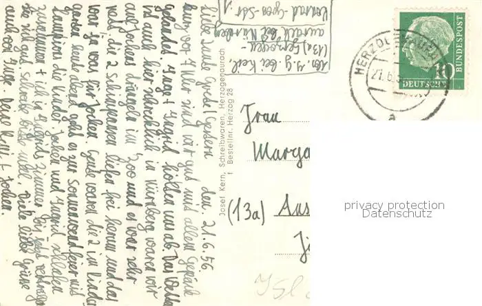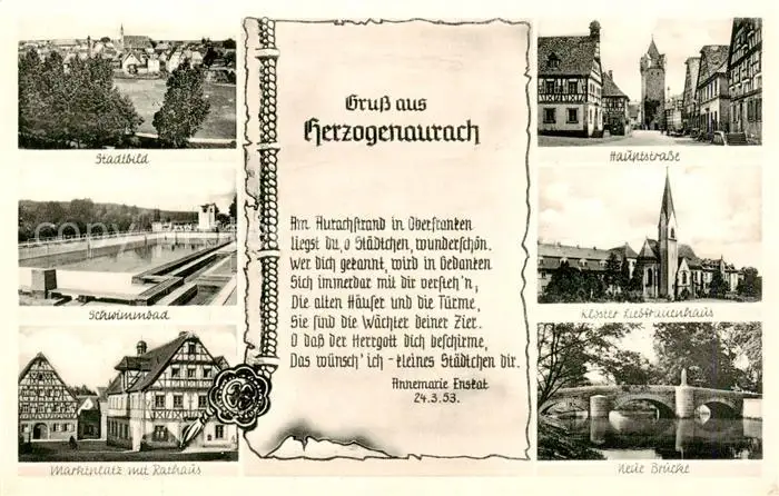 Herzogenaurach Stadtbild Schwimmbad Marktplatz Rathaus Hauptstrasse Kloster Liebfrauenhaus Neue Bruecke Herzogenaurach postalisch gelaufen 1956 Erhaltung siehe scans [FriedD77] Frierer