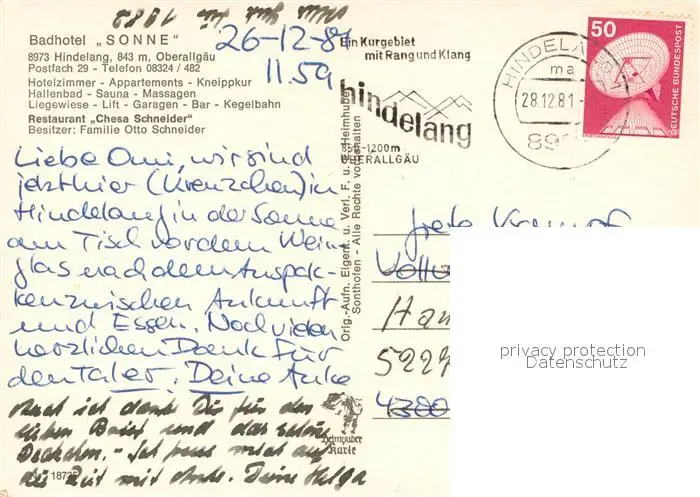 Hindelang Badhotel Sonne mit Chesa Schneider hallenbad Bierstube Appartement Restaurant Kaminstube Hindelang postalisch gelaufen 1981 Erhaltung siehe scans [WerneD78] WernPID7
