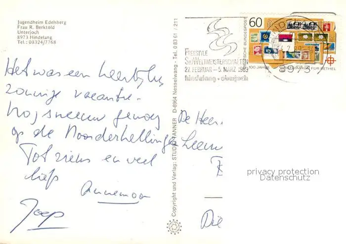 Hindelang Jugendheim Eselsberg Hindelang postalisch gelaufen 1989 Erhaltung siehe scans [KathaD81] Kathoren