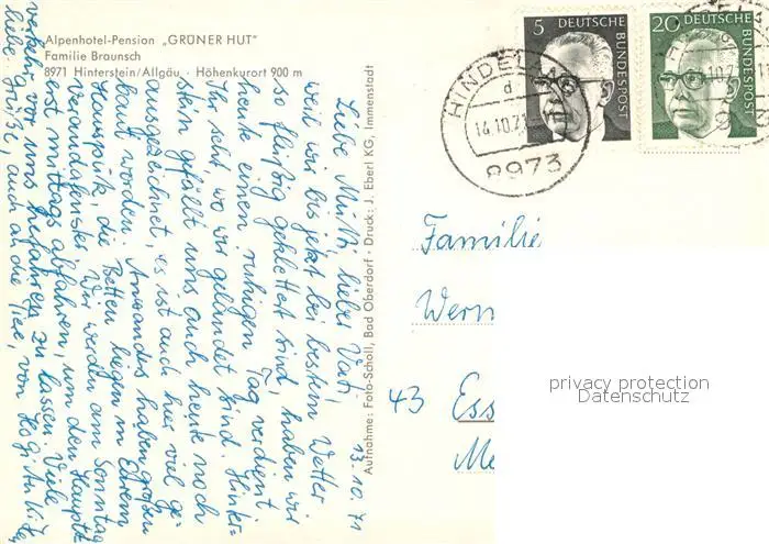 Hinterstein_Bad_Hindelang Alpenhotel Pension Gruener Hut Allgaeuer Alpen Hinterstein_Bad_Hindelang postalisch gelaufen 1971 Erhaltung siehe scans [FriedD77] Frierer