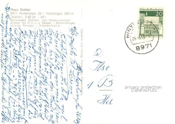 Hinterstein_Bad_Hindelang Kategorie Alte Ansichtskarten Postkarten bx45994 Hinterstein_Bad_Hindelang Haus Eichler Hinterstein_Bad_Hindelang postalisch gelaufen 1969 Erhaltung siehe scans [LiesaD40]