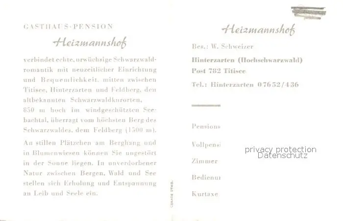 Hinterzarten Gasthaus-Pension Heizmannshof Hinterzarten postalisch nicht gelaufen 1921-1965 Keine Postkarte (siehe scan) Erhaltung siehe scans [PaolaD17] Keine Postkarte (siehe scan) PaolPID1