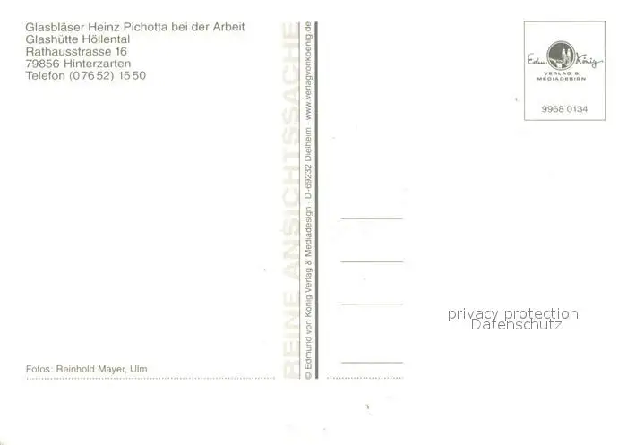 Hinterzarten Glasblaeser Heinz Pichotta bei der Arbeit Glashuette Hoellental Hinterzarten postalisch nicht gelaufen nach 1965 Erhaltung siehe scans [WerneD78] WernPID7