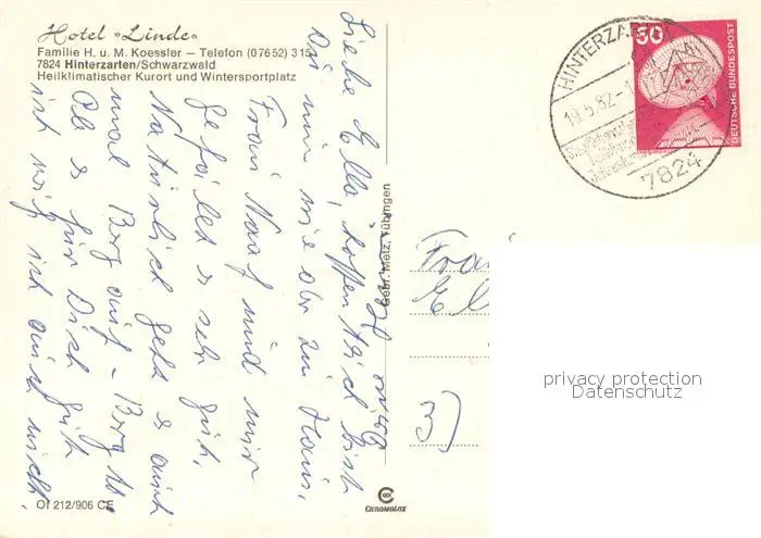 Hinterzarten Hotel Linde Hinterzarten postalisch gelaufen 1982 Erhaltung siehe scans [WerneD78] WernPID7
