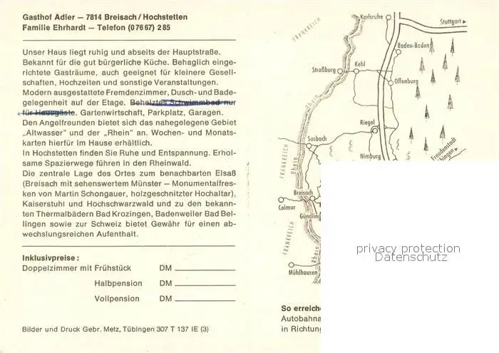 Hochstetten_Breisach_Rhein Gasthof Adler Gaststube Bar Breisacher Muenster Hochstetten_Breisach postalisch nicht gelaufen nach 1965 Werbekarte (keine Postkarte) Erhaltung siehe scans [WerneD78] Werbekarte (keine Postkarte) WernPID7