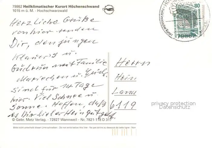 Hoechenschwand Teilansichten Wintersportplatz Schwarzwald Loipe Skipiste Hoechenschwand postalisch gelaufen 1996 Erhaltung siehe scans [FriedD77] Frierer