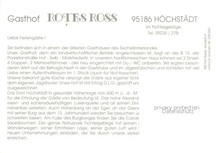Hoechstaedt_Oberfranken Gasthof Rotes Ross Hoechstaedt_Oberfranken postalisch nicht gelaufen nach 1965 Werbekarte (keine Postkarte) Erhaltung siehe scans [WerneD78] Werbekarte (keine Postkarte) WernPID7