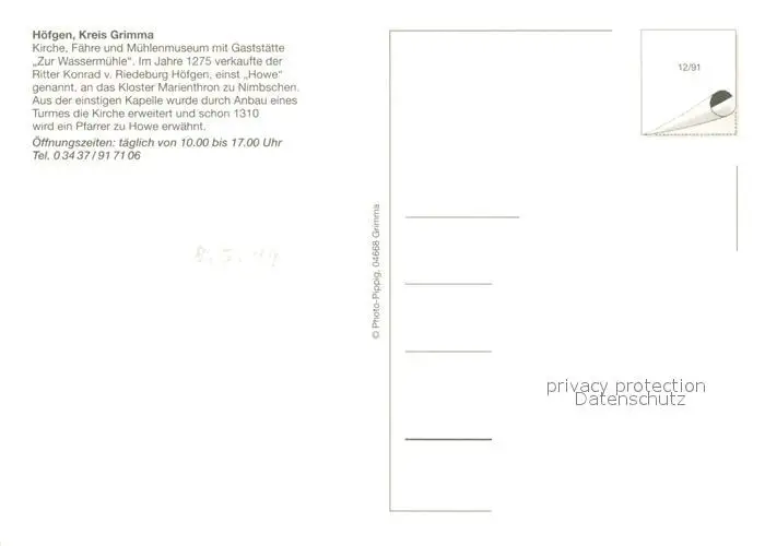 Hoefgen_Grimma Kirche Faehre Muehlenmuseum Gaststaette Zur Wassermuehle postalisch nicht gelaufen 1991 Erhaltung siehe scans [FriedD77] Frierer