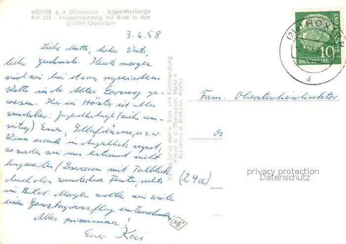 Hoexter_Weser Jugendherberge Hoexter Weser postalisch gelaufen 1958 Erhaltung siehe scans [PaolaD17] PaolPID1