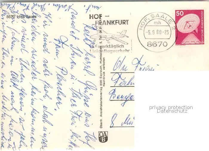 Hof_Saale Rathaus Stadtpanorama Theresienstein Central Kauf Freiheitshalle Wappen Hof_Saale postalisch gelaufen 1980 Erhaltung siehe scans [FriedD77] Frierer