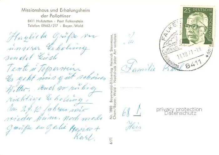 Hofstetten_Straubing Missionshaus-Erholungsheim der Pallottiner Hofstetten_Straubing postalisch gelaufen 1971 Erhaltung siehe scans [LiesaD40] LiesID40