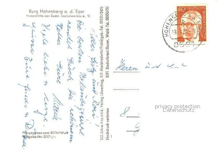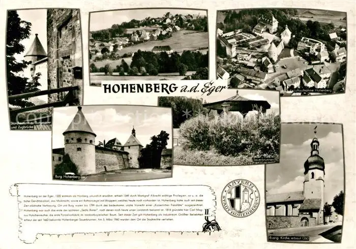 Hohenberg_Eger Storchenturm Burgmauer Zugbruecke Burg Kirche Brunnen Fliegeraufnahme Chronik Hohenberg Eger postalisch gelaufen 1974 Erhaltung siehe scans [FriedD77] Frierer