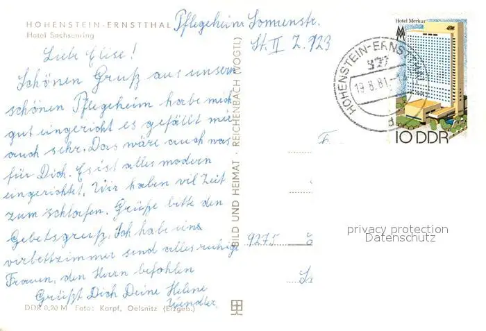 Hohenstein-Ernstthal Hotel Sachsenring Hohenstein-Ernstthal postalisch gelaufen 1981 Erhaltung siehe scans [WerneD78] WernPID7