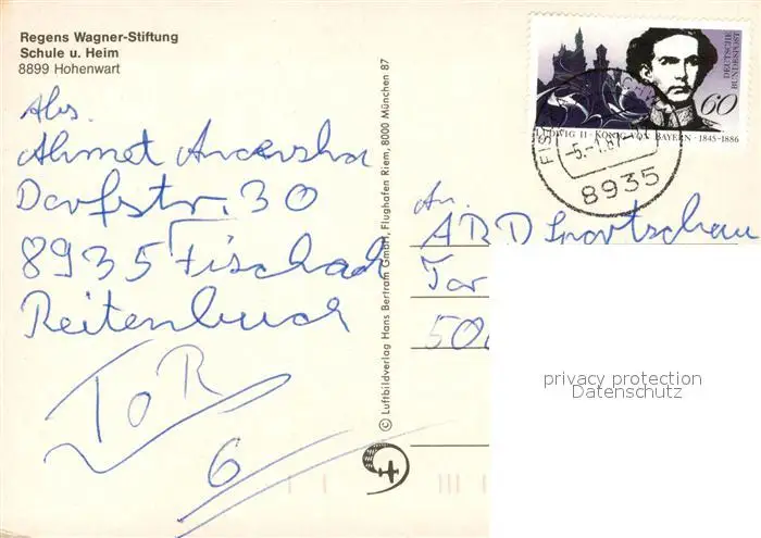 Hohenwart_Paar Fliegeraufnahme Rgens Wagner Stiftung Hohenwart Paar postalisch gelaufen 1987 Erhaltung siehe scans [KathaD81] Kathoren