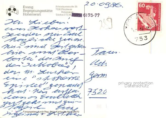 Hohenwart_Pforzheim Ev Begegnungsstaette Fliegeraufnahme Hohenwart Pforzheim postalisch gelaufen 1986 Erhaltung siehe scans [WerneD78] WernPID7