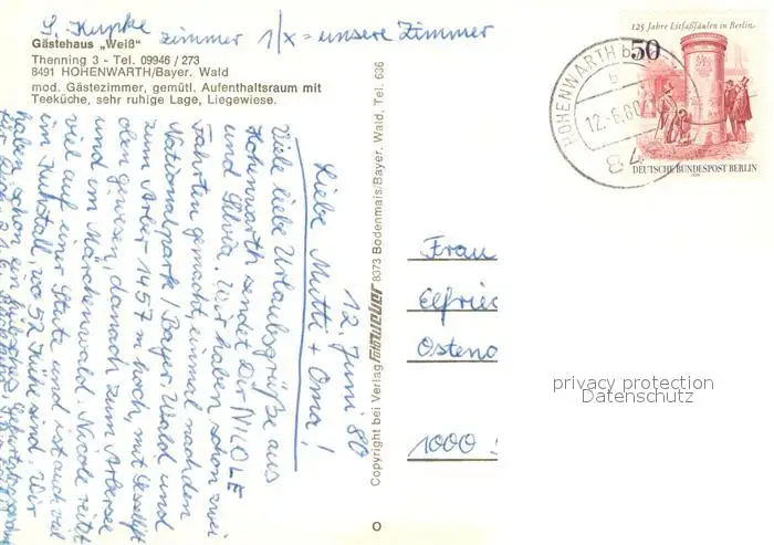 Hohenwarth_Koetzting Gaestehaus Weiss Hohenwarth Koetzting postalisch gelaufen 1980 Erhaltung siehe scans [FriedD77] Frierer