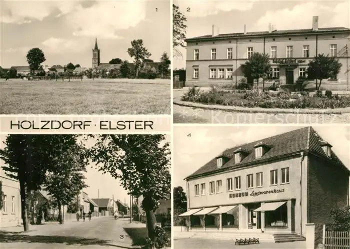 AK / Ansichtskarte Holzdorf_Elster Ansicht mit Kirche Bahnhof Dorfstrasse Konsum Landwarenhaus Holzdorf_Elster