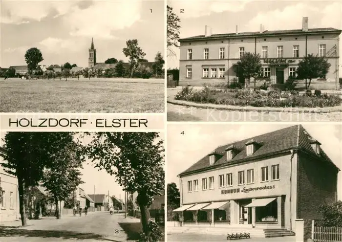 AK / Ansichtskarte Holzdorf_Elster Motiv mit Kirche Bahnhof Dorfstrasse Konsum Landwarenhaus Holzdorf_Elster