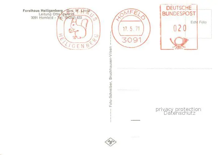 Homfeld_Grafschaft_Hoya Forsthaus Heiligenberg Homfeld_Grafschaft_Hoya postalisch gelaufen 1971 Erhaltung siehe scans [WerneD78] WernPID7