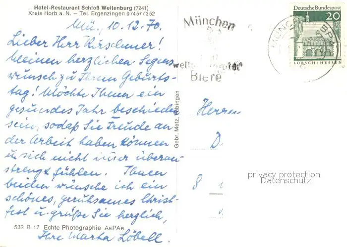 Horb_Neckar Hotel Restaurant Schloss Weitenburg Horb Neckar postalisch gelaufen 1970 Erhaltung siehe scans [WerneD78] WernPID7